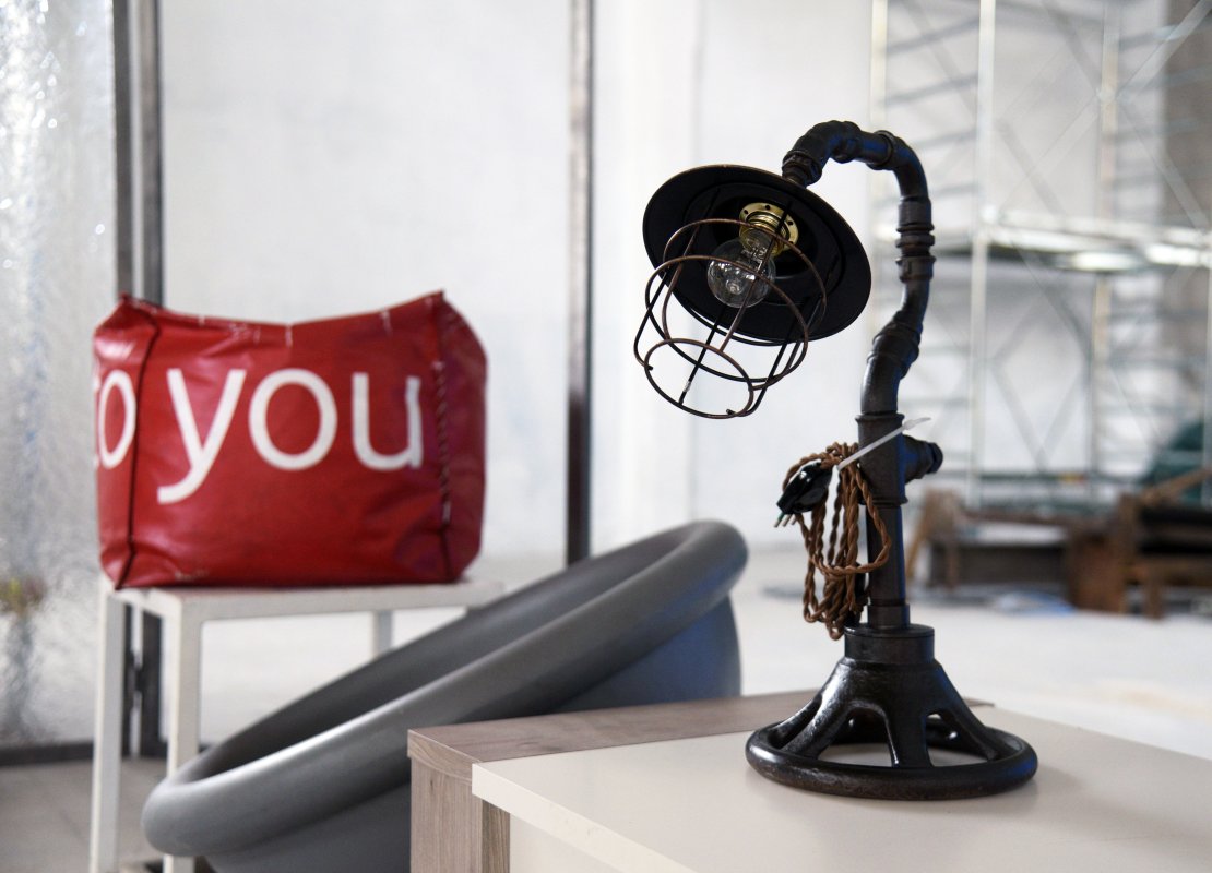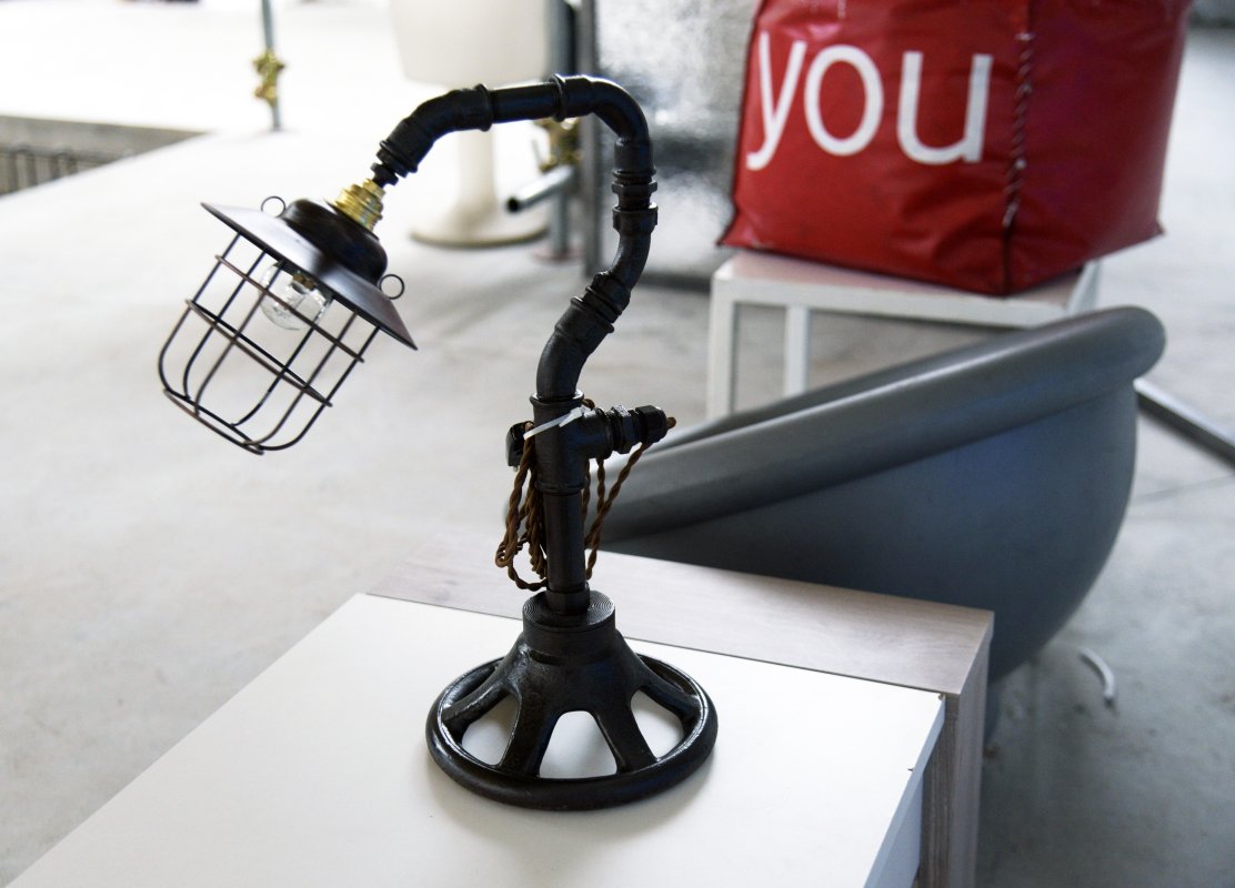 Abat-jour realizzata con componenti industriali di riuso: una manopola di valvole a ghigliottina fa da base per la struttura che è stata realizzata con un tubo mannesman da 1/2".